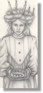 On the twelfth night of December, Lucia, the youngest daughter of her house, is given a gift of light by her mother so she can wake early the next morning to deliver cakes and coffee to the rest of her family. Lussi, a spirit of darkness, steals Lucia’s light. Dismayed and embarrassed by her loss, Lucia sets out to find Lussi and recover the stolen gift. Along the way, Lucia traverses many lands and meets many strange and beautiful beings. Eventually, Lucia arrives in Lussi’s realm, where Lussi proudly displays Lucia’s stolen light. When Lussi becomes distracted, Lucia takes back her mother’s gift but finds the light burns no longer. Heartbroken, Lucia returns home, where she admits to her mother that she lost her gift. Instead of being upset, Lucia’s mother praises her. She tells Lucia that because she held true to the virtues of purity, charity and hope, the light is not gone, for it burns deep within her. The three virtues arrive, bearing gifts for Lucia. Purity brings a dress of white, Charity a sash of red, and Hope a wreath of evergreens bearing many candles. Lucia dons her new attire and lights the wreath.